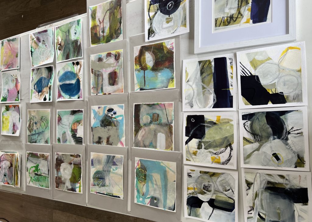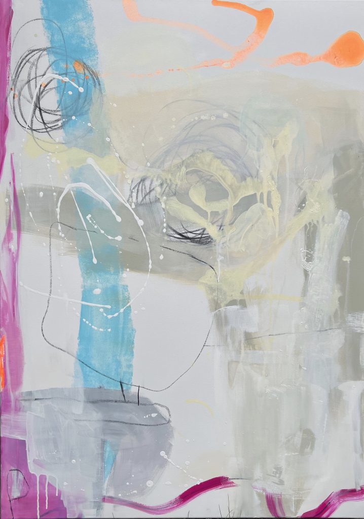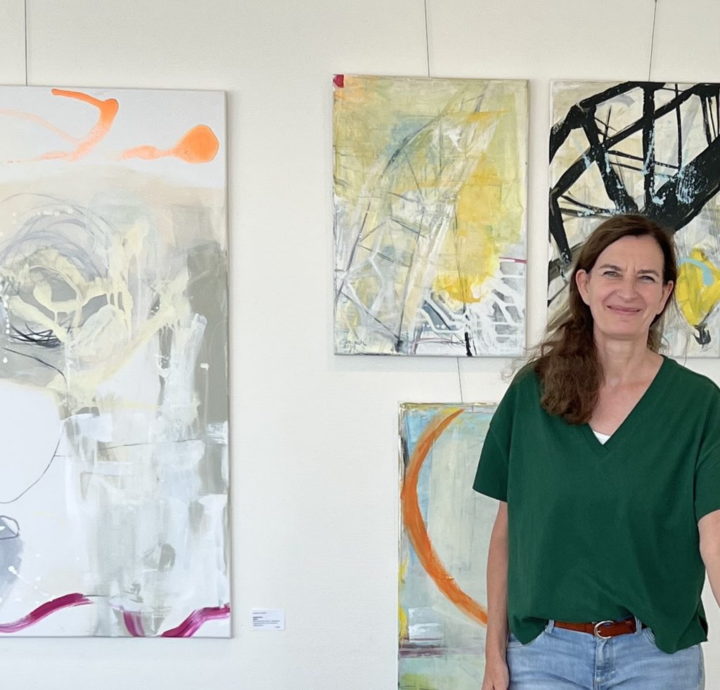 Corinna Leusch arbeitet gern mit unterschiedlichen Materialien wie Pigmenten, Kohle und Acrylfarben und kombiniert alles in ihren abstrakten Bildern. Am Anfang steht meist ein Gefühl für eine Form, Farbe oder Stimmung – inspiriert aus der Natur oder auch einfach aus kleinen Alltagsmomenten. Landschaft, Menschen und Architektur werden intuitiv zu Flächen und Linien, manchmal bleibt es gegenständlich manchmal wird es abstrakt, aber immer ist es etwas Persönliches