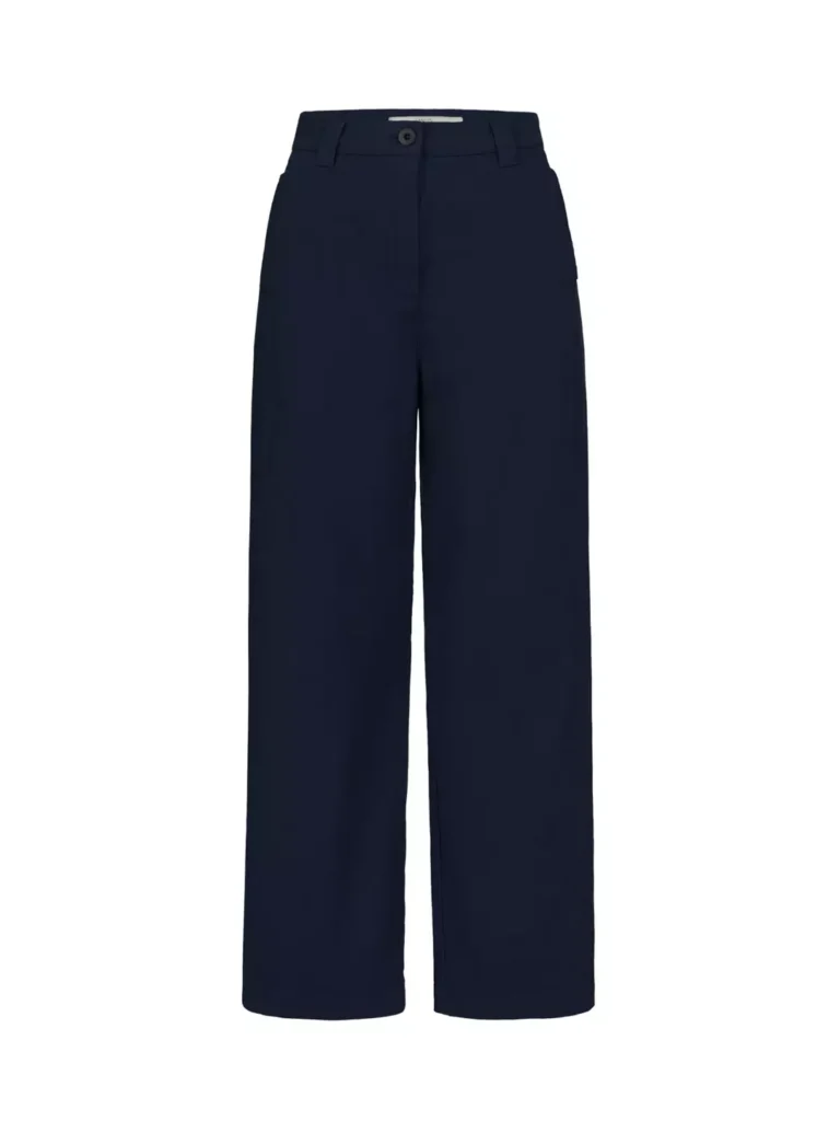 Die gebürstete Bio-Baumwolle verleiht der Hose einen weichen Griff, die Festigkeit des Materials und der kleine Elasthananteil sorgen für einen guten Sitz und eine schmeichelnde Passform. Der hohe Bund und das gerade, weite Bein verlängern die Silhouette optisch. Die hohe Passform trägt sich vorteilhaft zu verkürzten Oberteilen, oder leger kombiniert mit Blusen und Hemden zu Boots oder Sneakern.